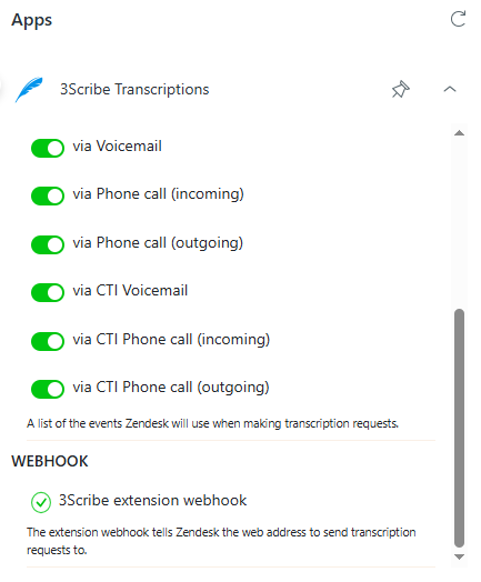 “Webhook, active 3Scribe extension webhook. The extension webhook tells Zendesk the web address to send transcription requests to.”